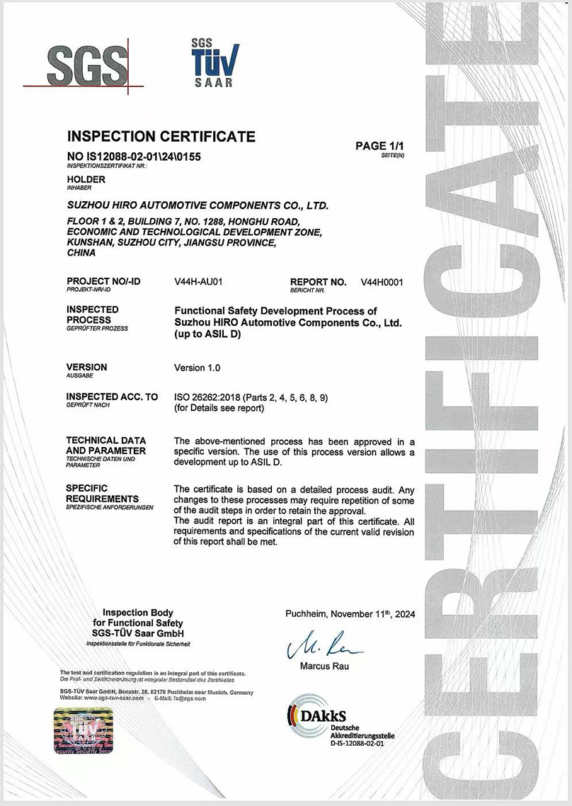 12月30日,苏州衡鲁汽车部件有限公司正式获得国际公认的ISO 26262功能安全最高等级ASIL D认证证书。这一里程碑式的成就标志着衡鲁汽车在功能安全领域达到了国际最高标准,也体现了衡鲁汽车对产品质量和安全的极致追求。